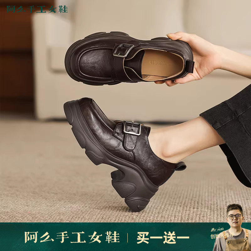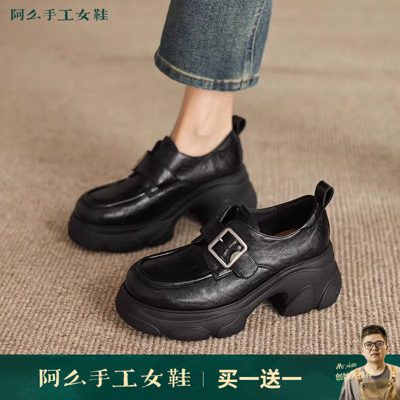 阿么手工女鞋厚底英伦风真皮气质粗跟乐福鞋时尚百搭圆头单鞋新款