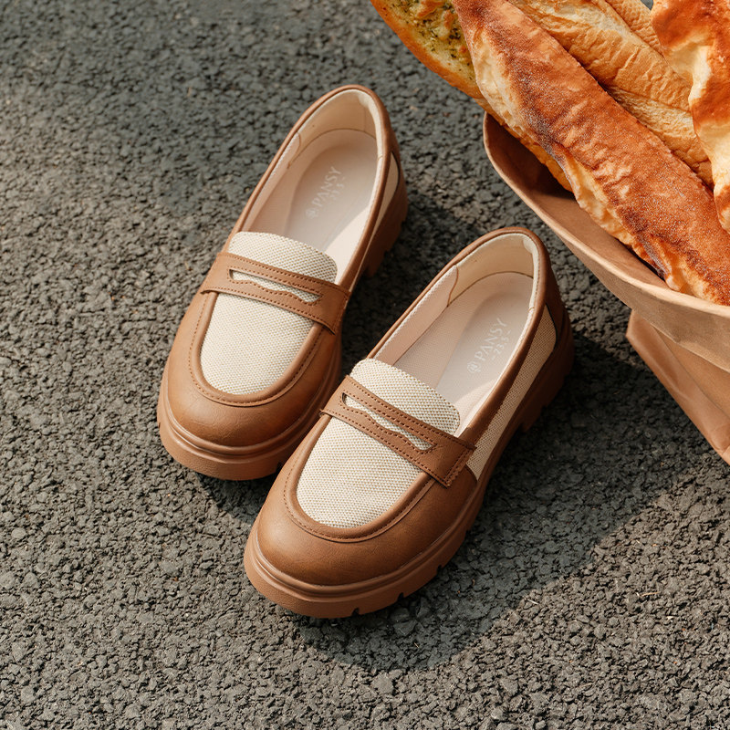 Pansy盼喜26春夏英伦风圆头乐福鞋女休闲一脚蹬软皮拼色中跟单鞋