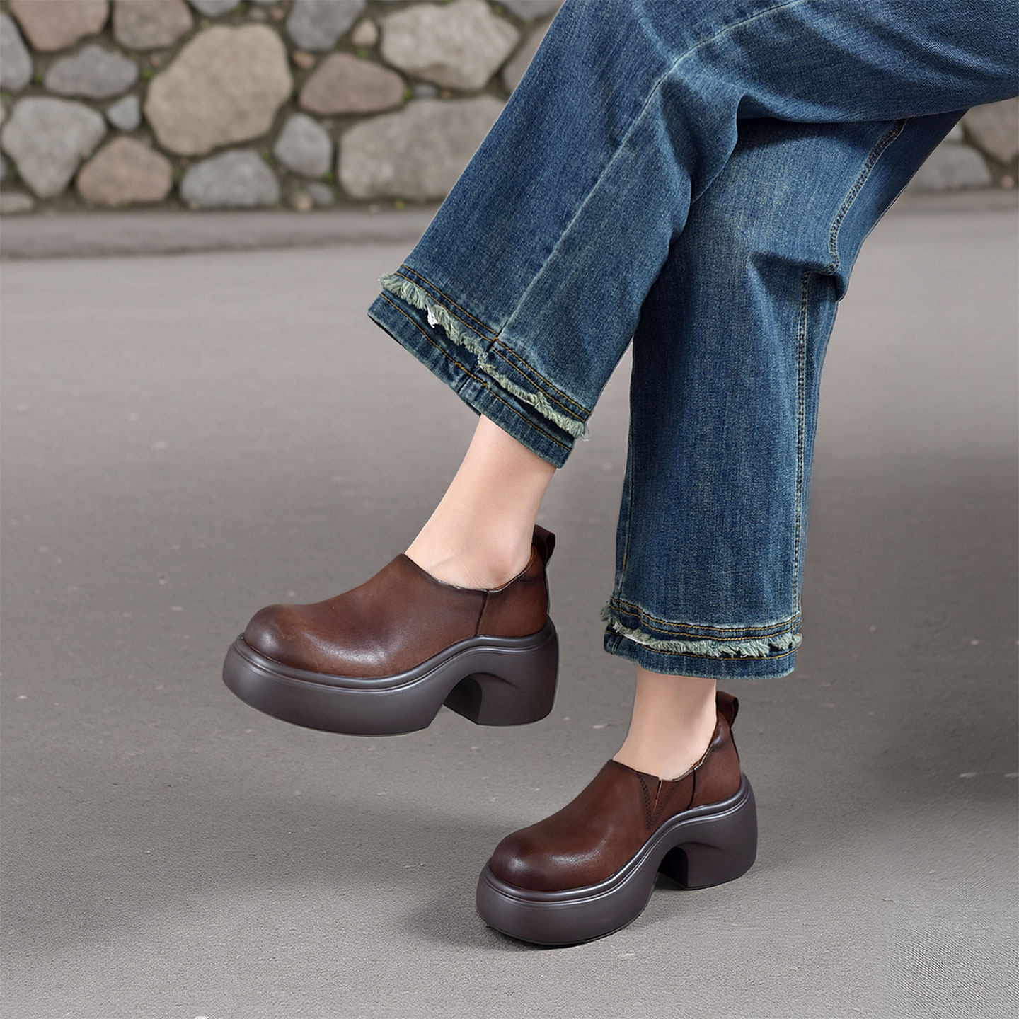 真皮~骄屿复古一脚蹬乐福鞋女厚底粗跟圆头单鞋百搭英伦风小皮鞋