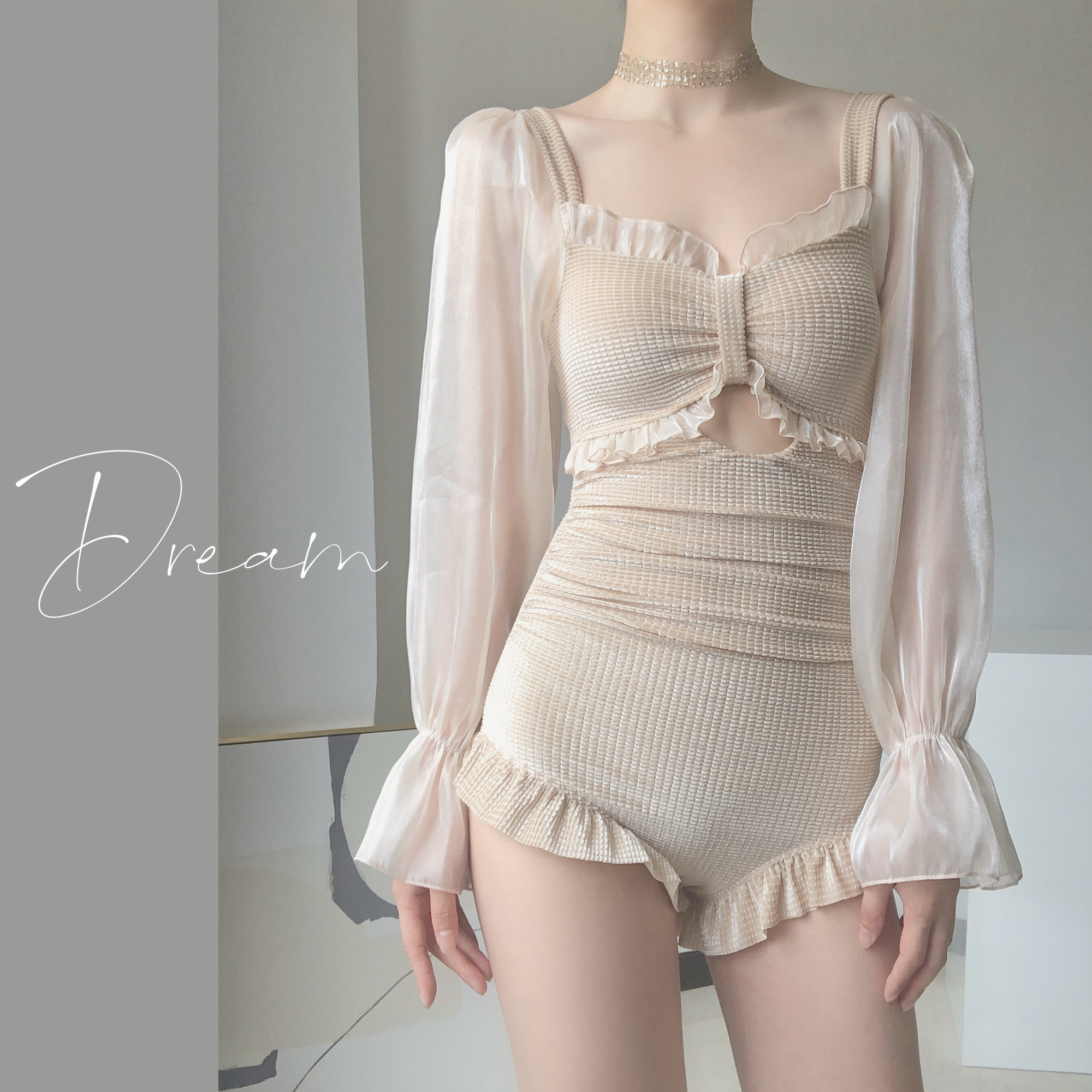 蜜Dream泳衣女泡温泉保守仙气韩国连体长袖遮肉显瘦学生少女泳装