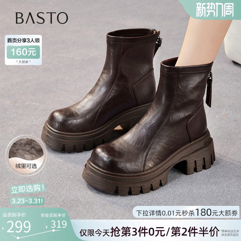 全牛皮粗跟短靴女士2026新款春夏季高跟时装靴加绒马丁靴瘦瘦靴