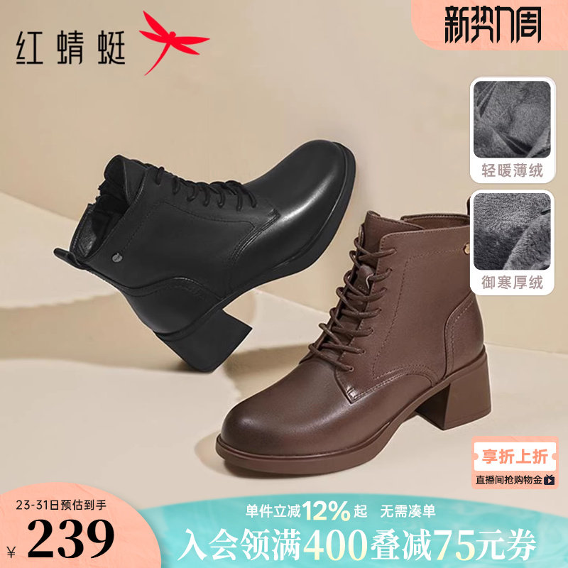 红蜻蜓女鞋马丁靴单靴气质时装靴真皮高跟短靴粗跟尖头靴断码清仓