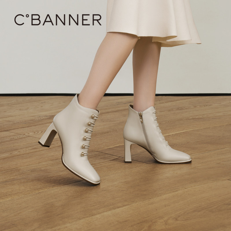秋单靴米白色短靴女高跟2024款真皮粗跟女靴显瘦马丁靴冬加绒棉靴