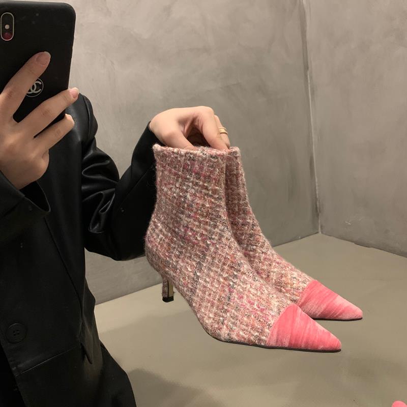 香港女式秋冬高跟小香短靴2025法国新时尚尖头细高跟修身单靴