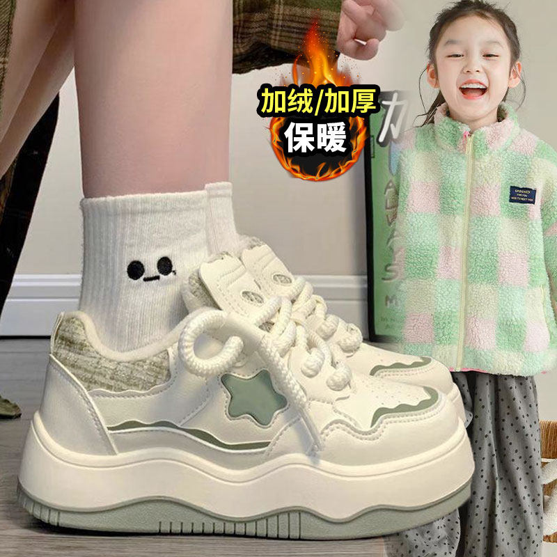 学生厚底小白鞋2026冬款百搭女童平底鞋二棉网红原创时尚加绒童鞋