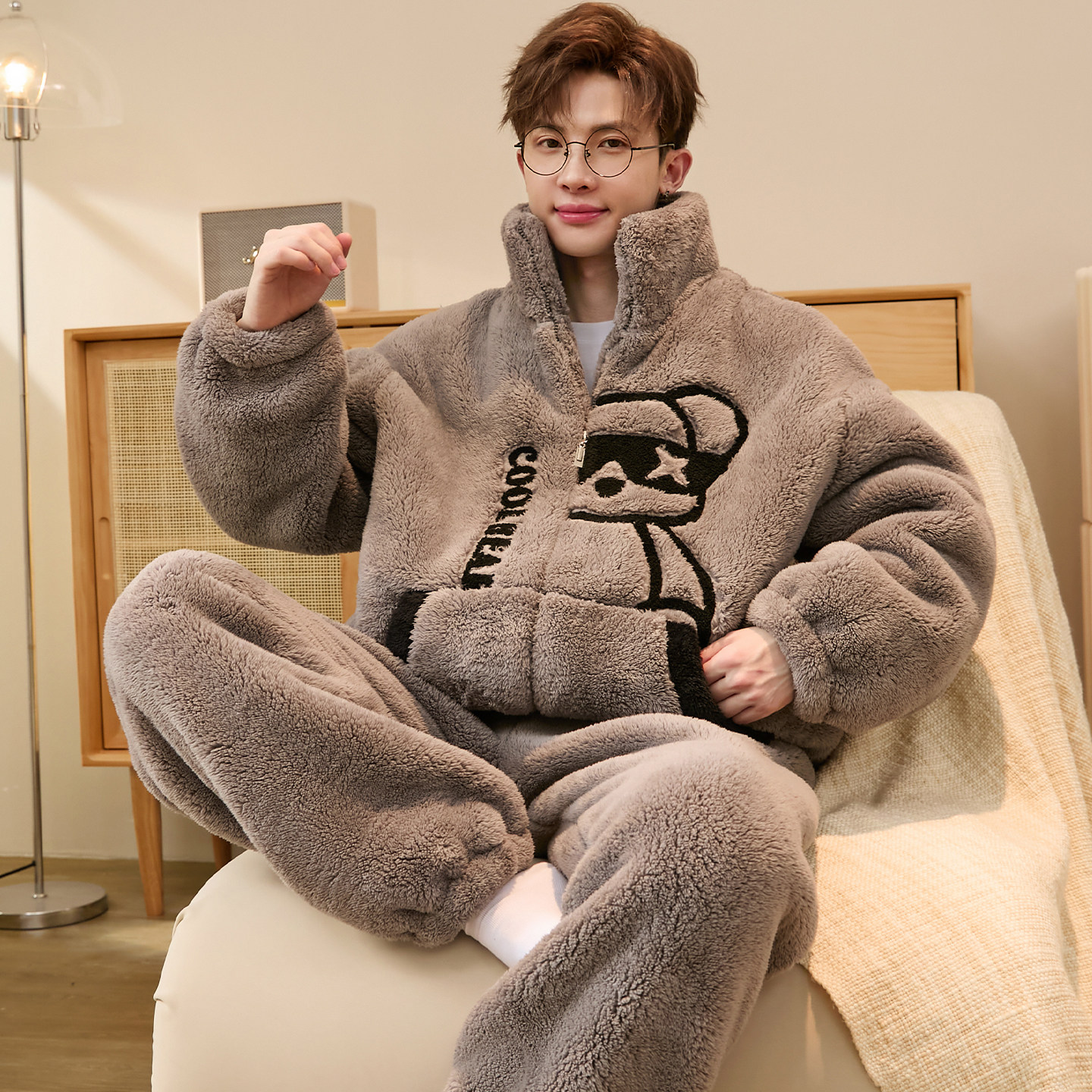 秋冬季珊瑚绒睡衣男士拉链款长袖加厚学生保暖卡通休闲家居服套装