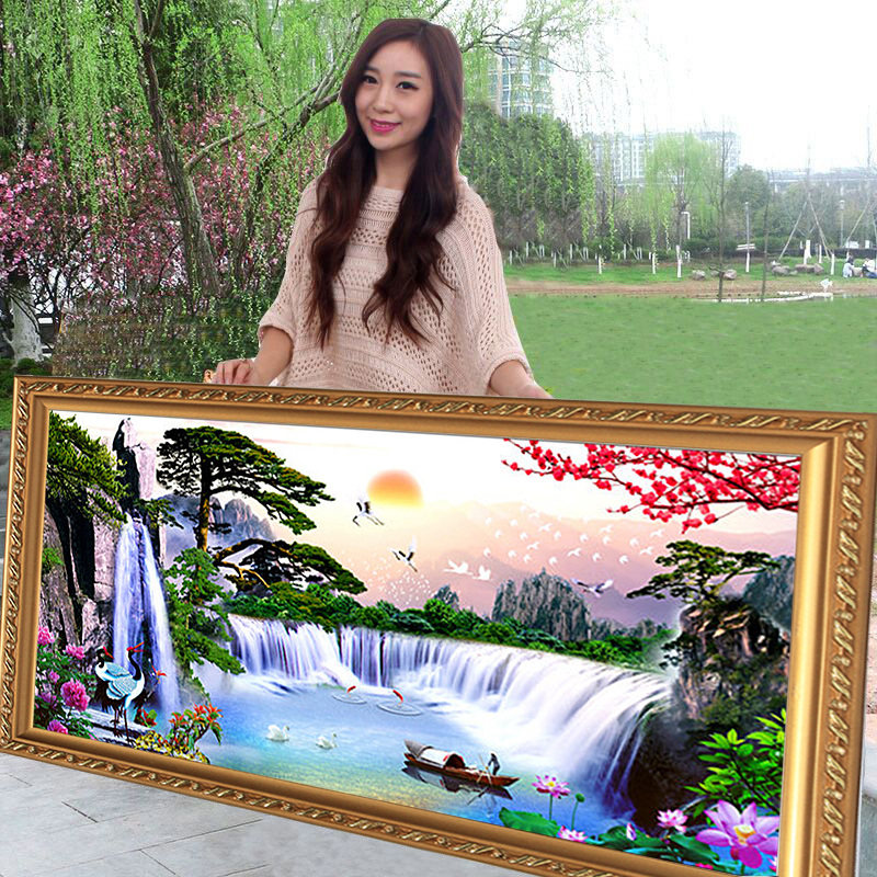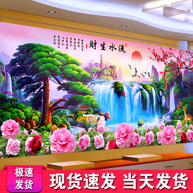 蒙娜丽莎十字绣线绣新款客厅大幅迎客松简约现代流水生财山水挂画