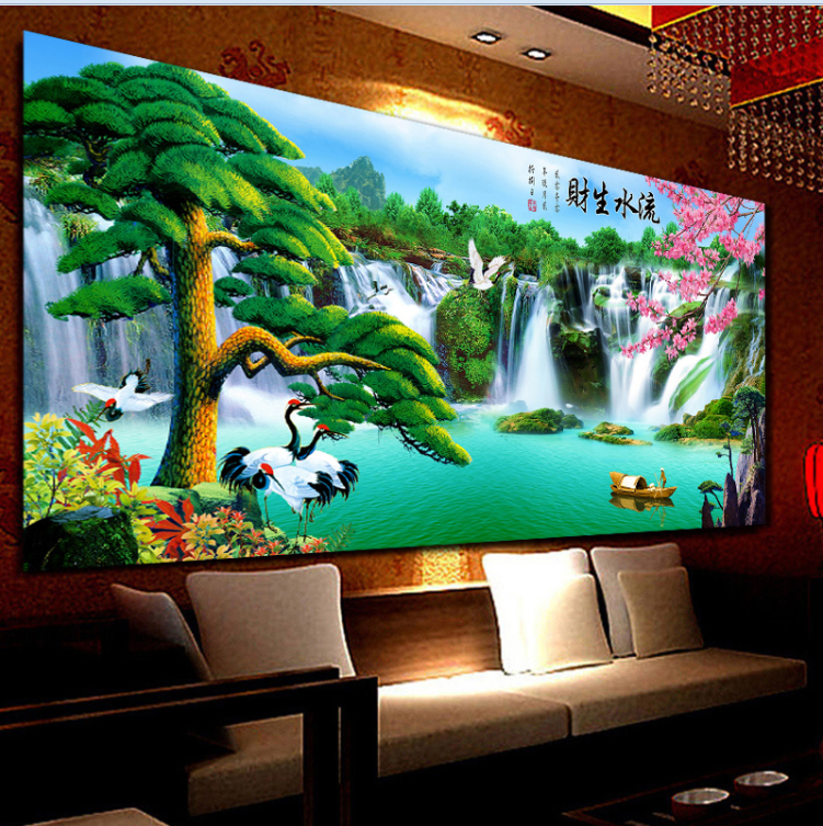 流水生财迎客松财运版钻石画点钻十字绣客厅新款客厅风景砖秀满钻
