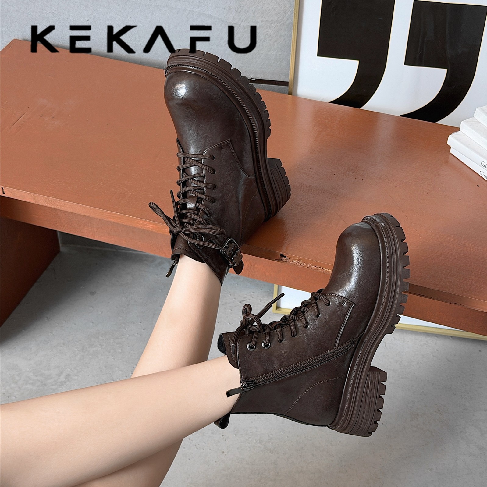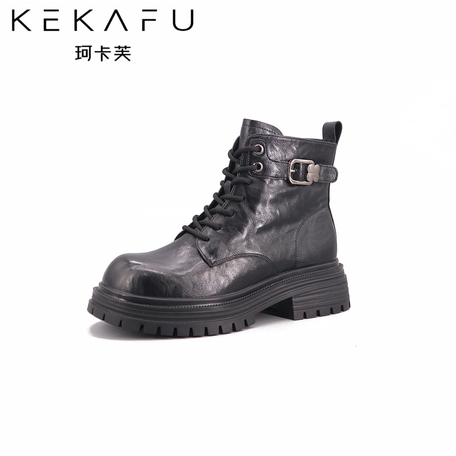 - 马丁粗跟短靴女系带真皮靴