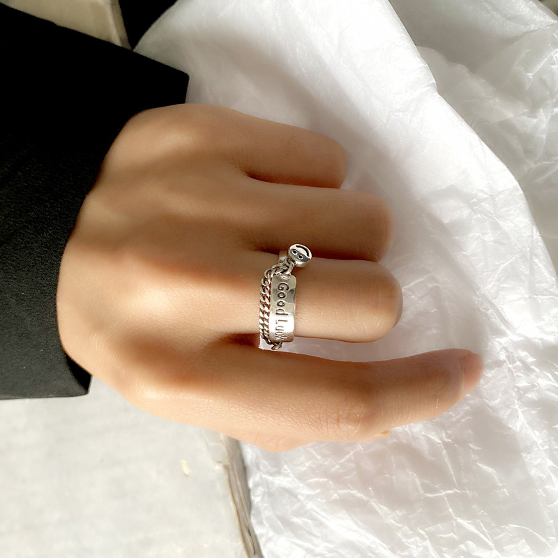 日韩s925纯银笑脸戒指女 ins潮人开口食指戒简约网红好运个性字母