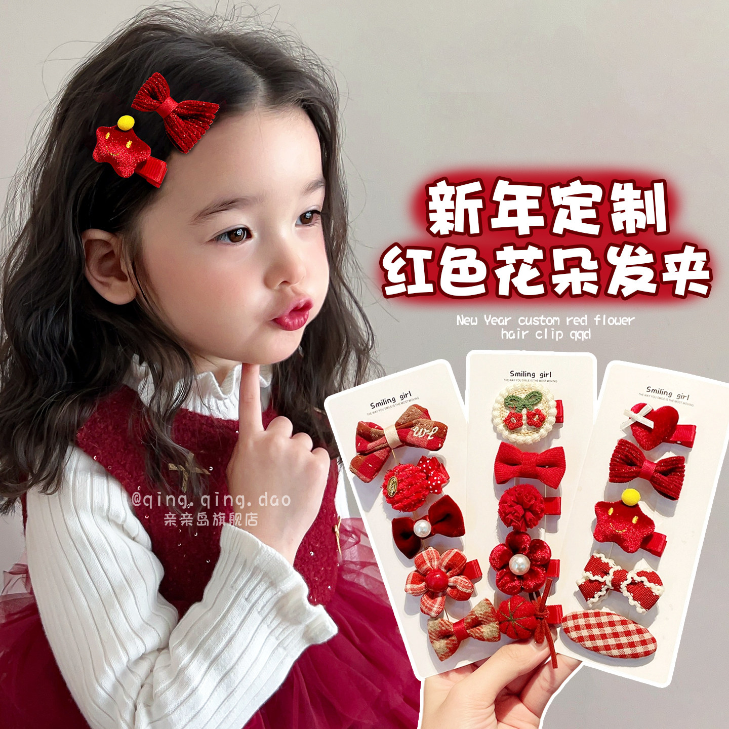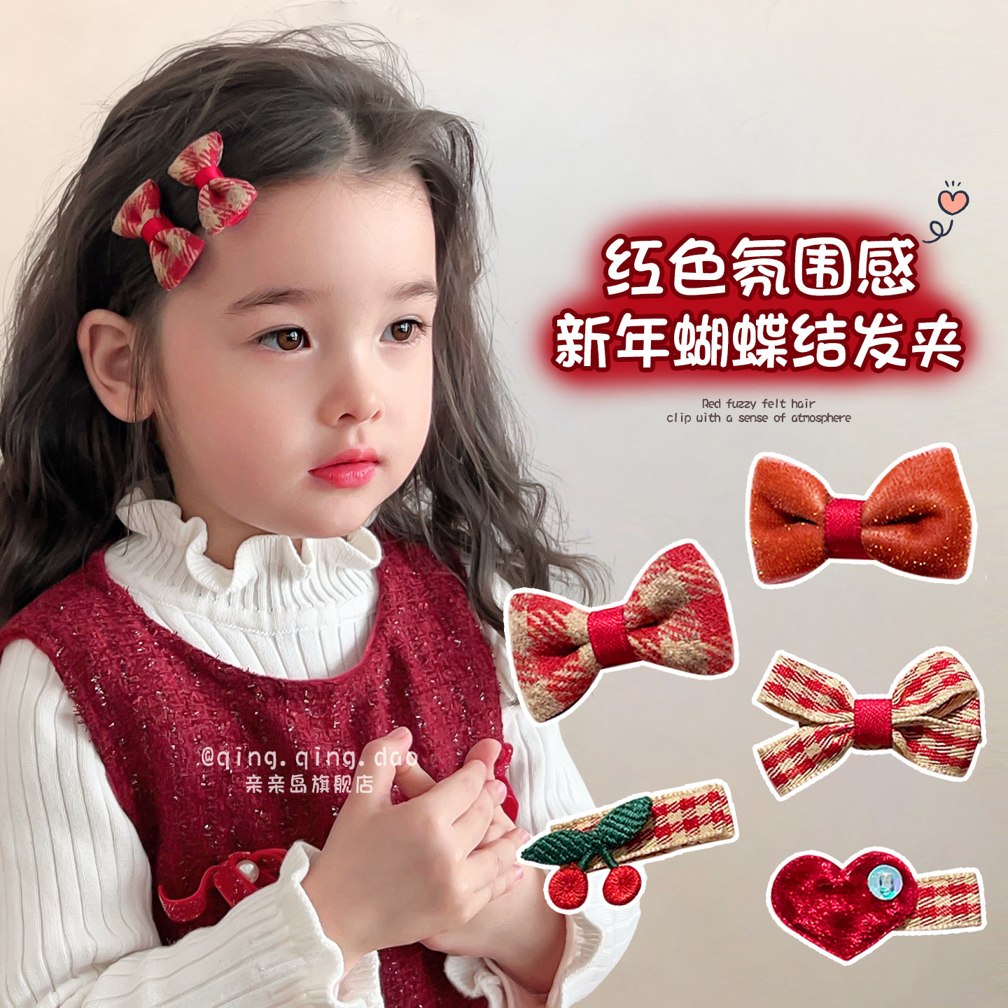 儿童新年红色蝴蝶结发夹宝宝全包布不伤发鸭嘴夹女童刘海发卡头饰