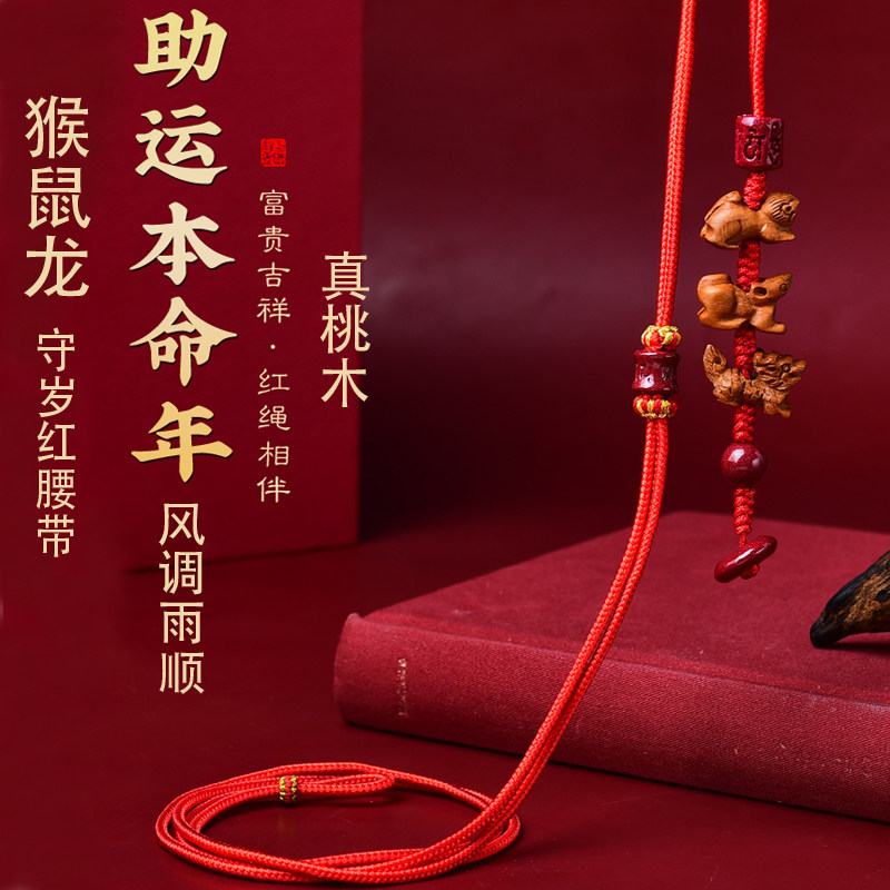 正宗真桃木猴鼠龙本命年三合红腰带男女朱砂转运珠六合保岁腰红绳