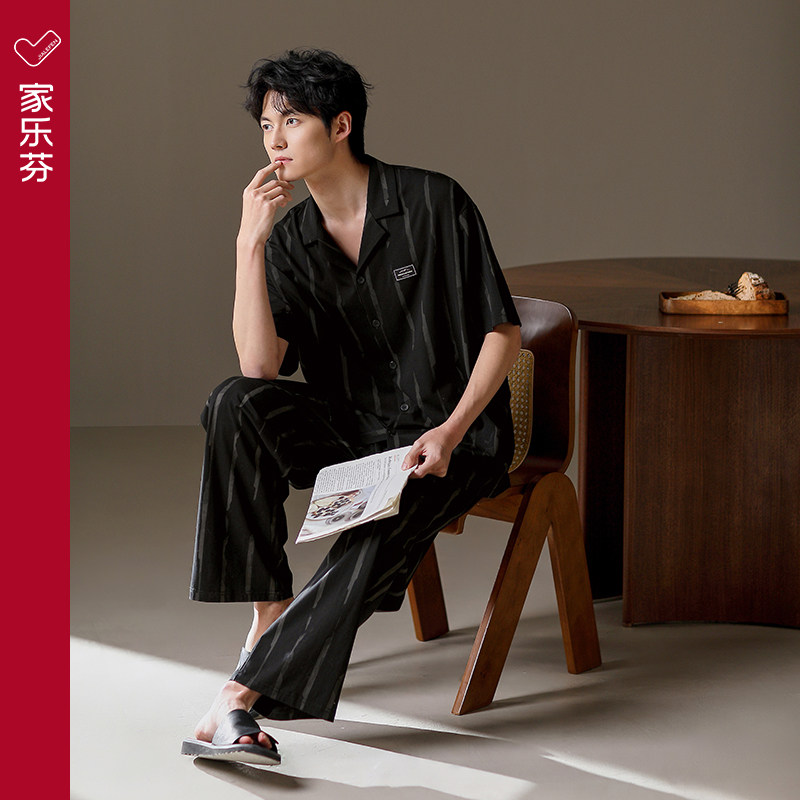 家乐芬睡衣男士夏季夏天夏款莫代尔短袖长裤家居服黑色高级感冰丝