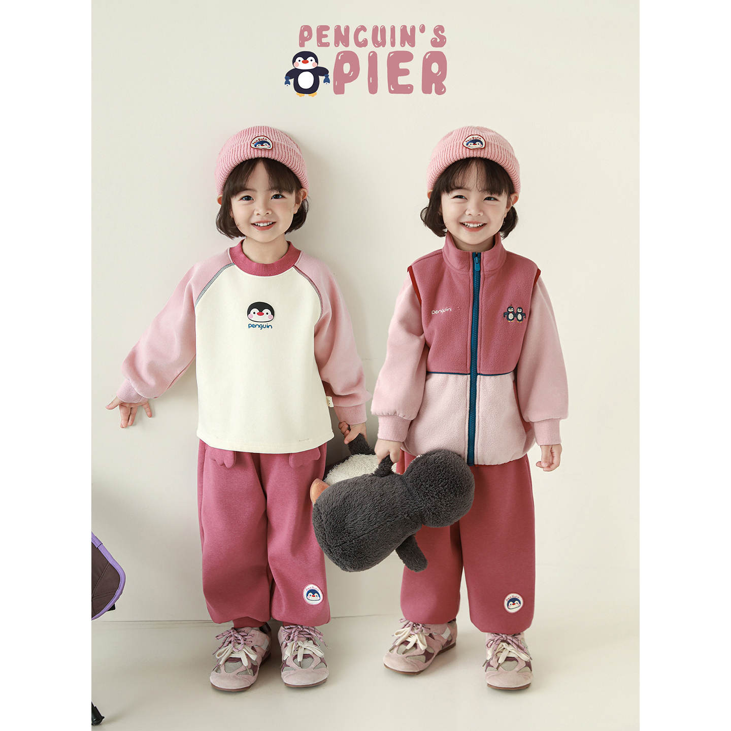 幼悠女童2025冬季新款加厚保暖插肩卫衣无袖马甲束脚长裤企鹅套装
