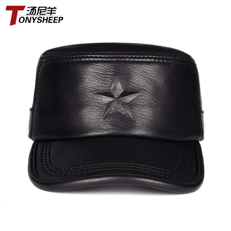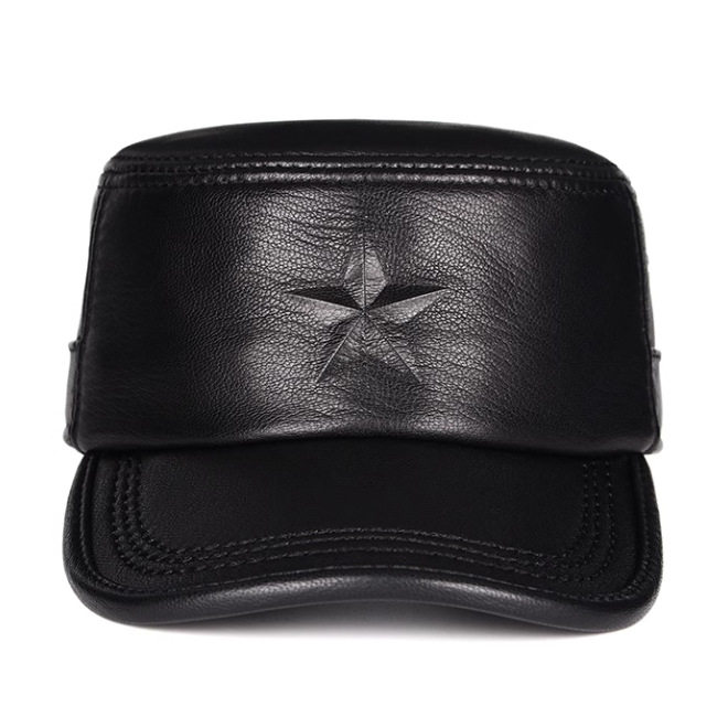 中老年人户外时尚休闲真皮五角星平顶鸭舌帽男士羊皮秋冬季老人帽