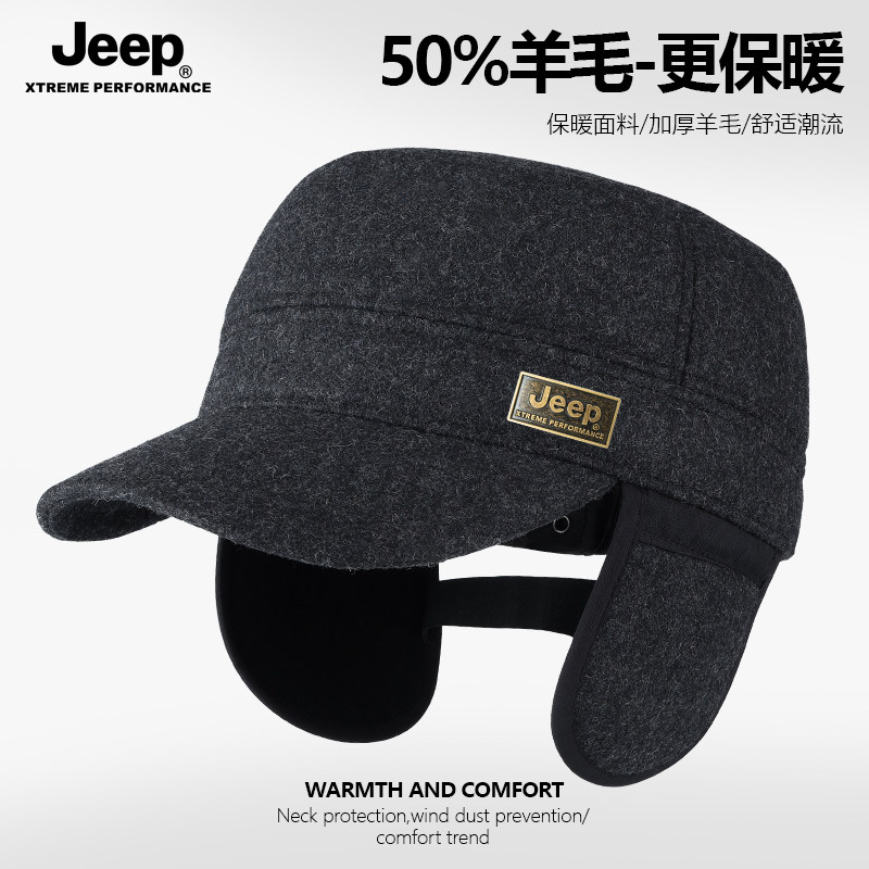 JEEP羊毛平顶帽中老年人帽子男士秋冬季老人帽防寒保暖护耳帽抗寒