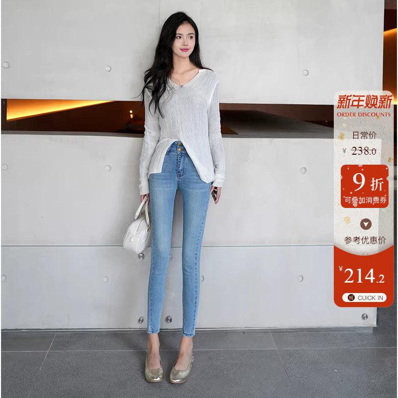 dcsh高弹力小脚牛仔裤女夏季浅蓝色两粒扣高腰修身显瘦九分铅笔裤