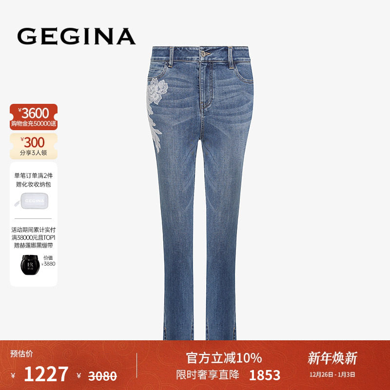 GEGINA吉吉娜夏季新品蕾丝绣花百搭牛仔裤修身显瘦时髦九分小脚裤