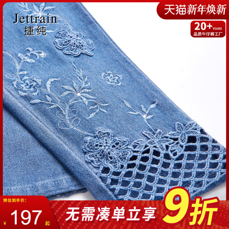 捷纯镂空牛仔裤女夏季刺绣高腰四面弹力大码设计感时尚九分小脚裤