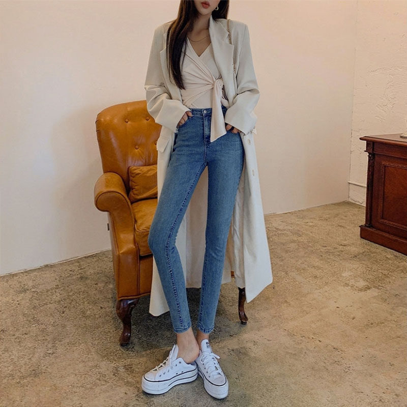 夏季薄款韩版气质牛仔裤女弹力紧身小脚裤高腰时尚简约包臀九分裤