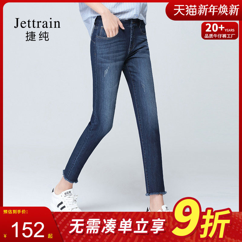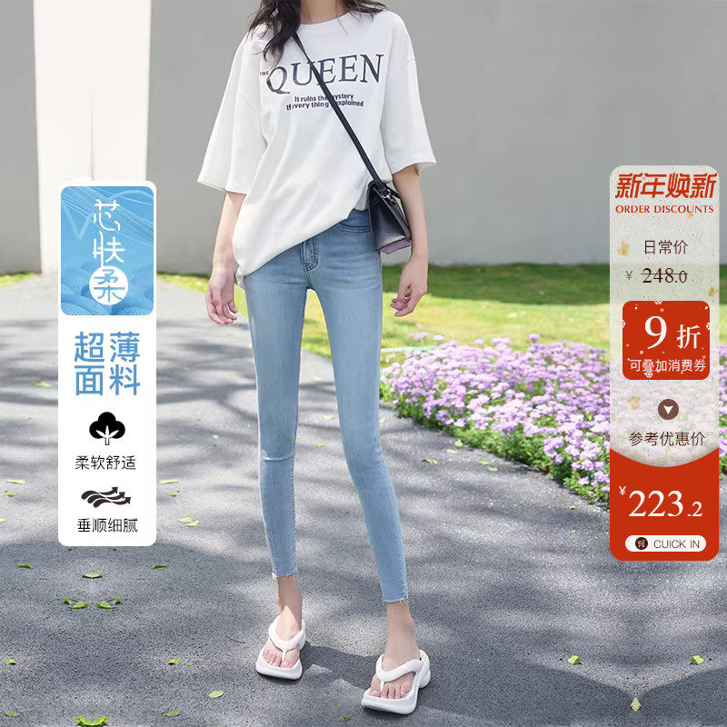捷纯九分毛边小脚裤女夏季时尚薄料高腰四面弹力修身铅笔牛仔裤子