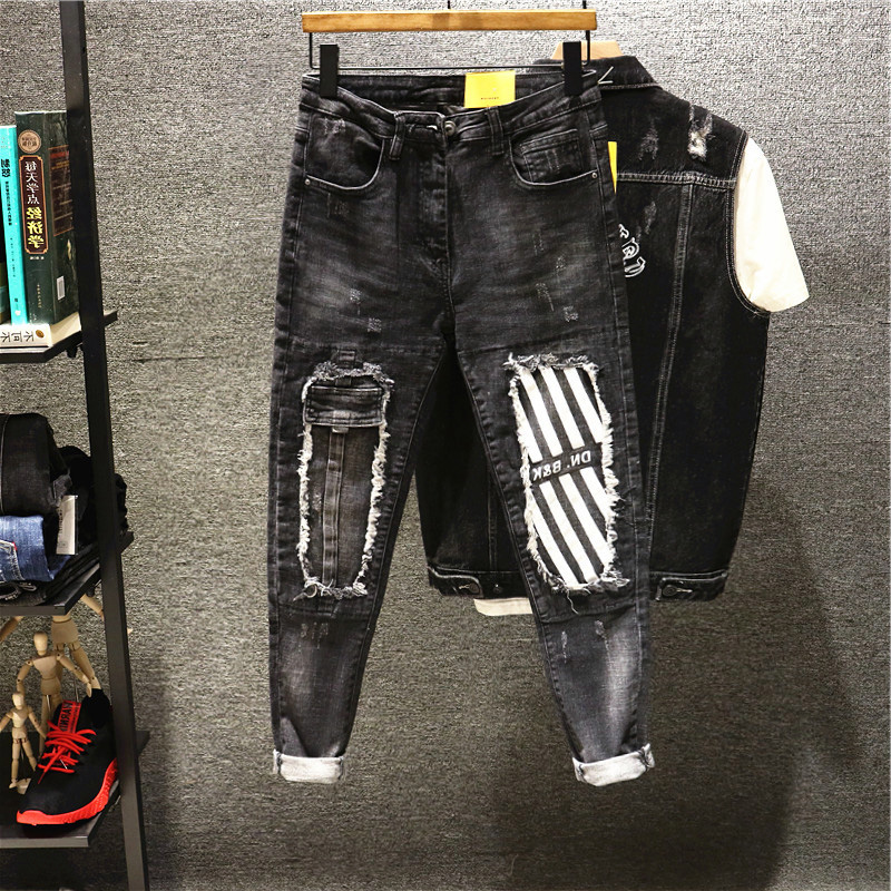 补丁破洞牛仔裤男士2024潮牌夏季新款拼接修身小脚百搭休闲九分裤