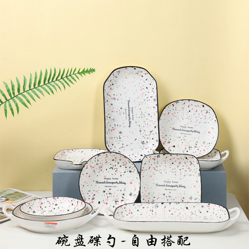 千顺陶瓷水磨石釉下彩绘横纹饭碗菜盘大汤碗面碗双耳烤盘北欧风格