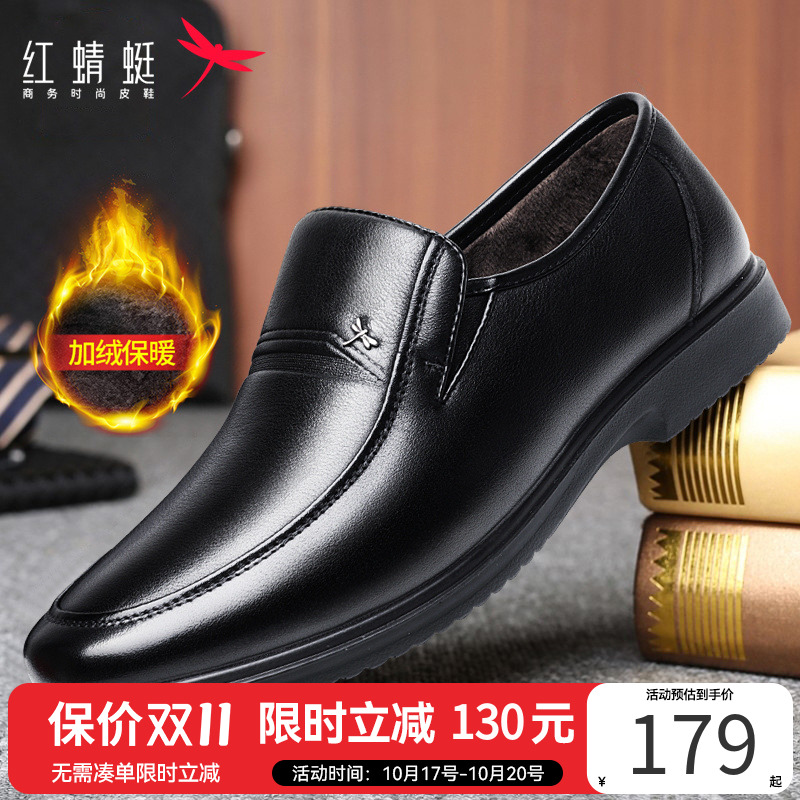 红蜻蜓皮鞋男士真皮软底秋冬款商务休闲加绒保暖舒适中老年爸爸鞋