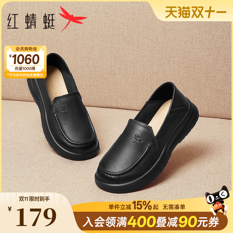 红蜻蜓皮鞋女秋季新款一脚蹬女鞋黑色妈妈单鞋软底真皮平底乐福鞋