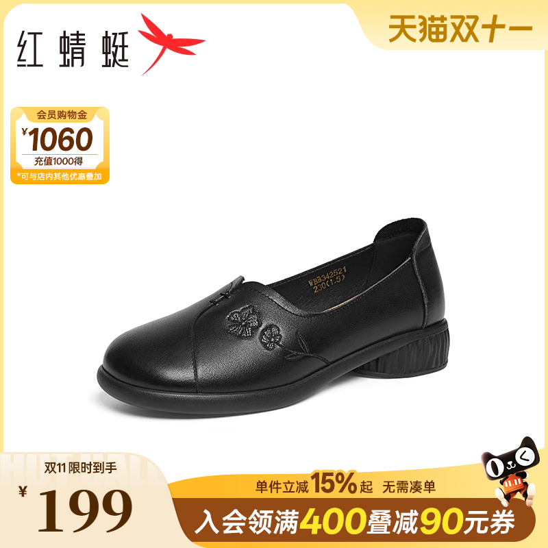 红蜻蜓皮鞋女妈妈款2025秋季新款女鞋黑色真皮软底单鞋中老年鞋子