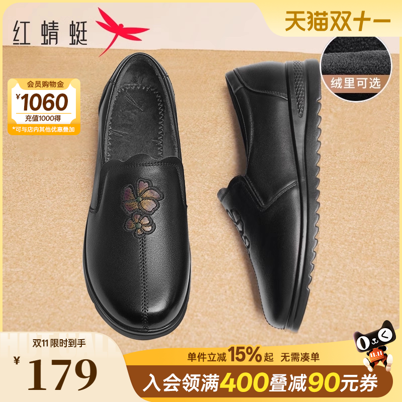 红蜻蜓皮鞋女妈妈鞋秋冬真皮软底中老年鞋子舒适平底加绒奶奶单鞋