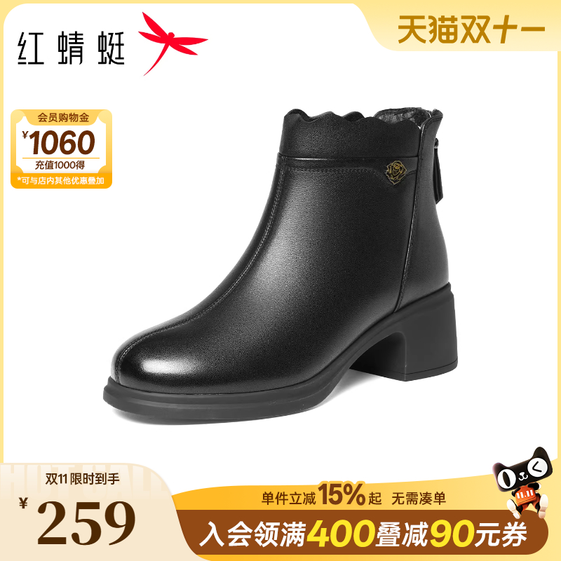 红蜻蜓皮鞋女款妈妈短靴2025秋冬新款女鞋靴子加绒黑色气质高跟鞋