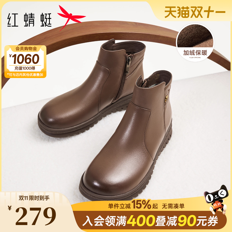 红蜻蜓皮鞋女妈妈棉鞋2025冬季新款女鞋加绒保暖真皮中老年人鞋子