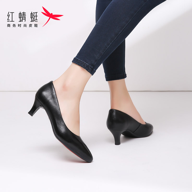 红蜻蜓皮鞋女鞋春夏通勤上班鞋中细高跟鞋一脚蹬懒人浅口职业单鞋