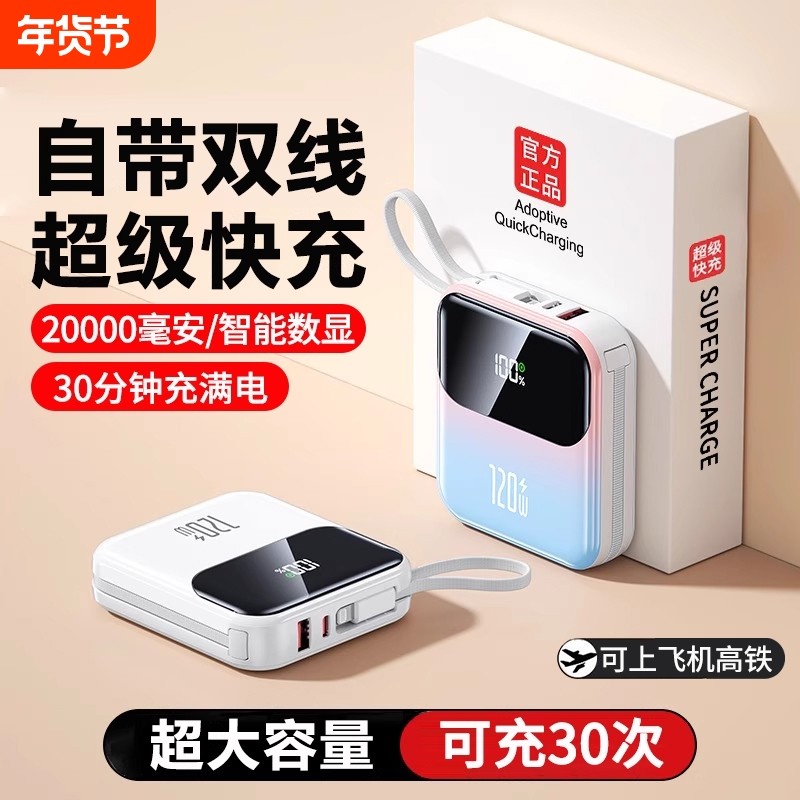 正品自带线充电宝超薄小巧便携迷你快充50000毫安超大容量2万移动电源可爱适用华为oppo苹果vivo手机专用