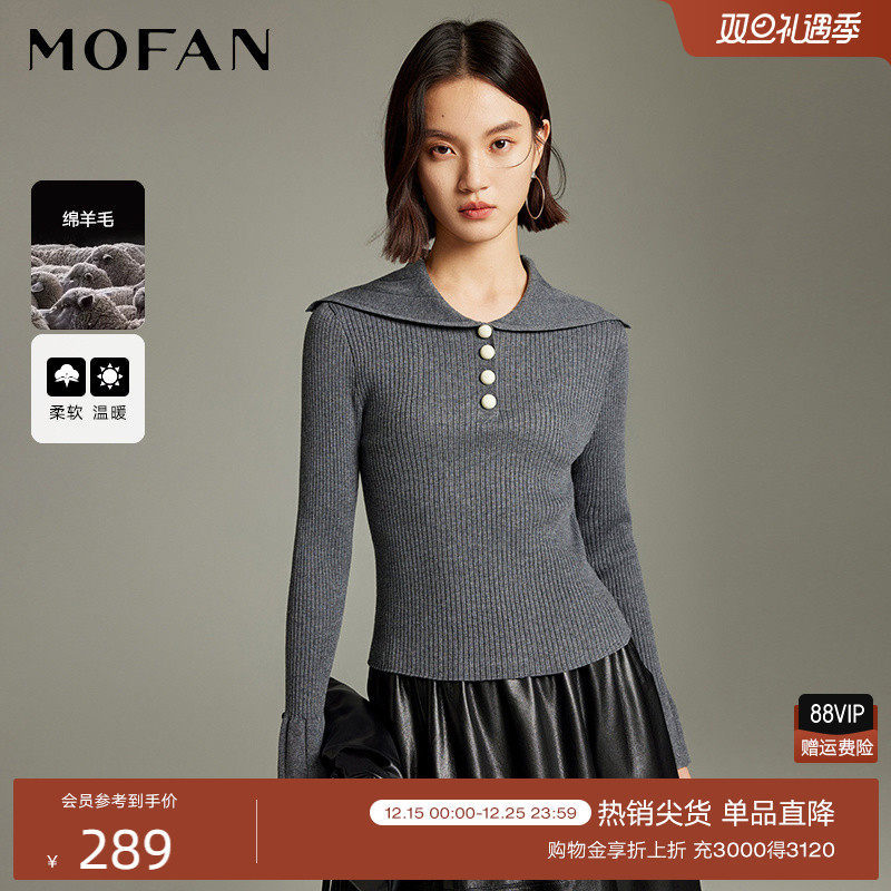 时尚优雅银灰喇叭袖羊毛衫女MOFAN摩凡2025冬新款翻领毛衣针织衫