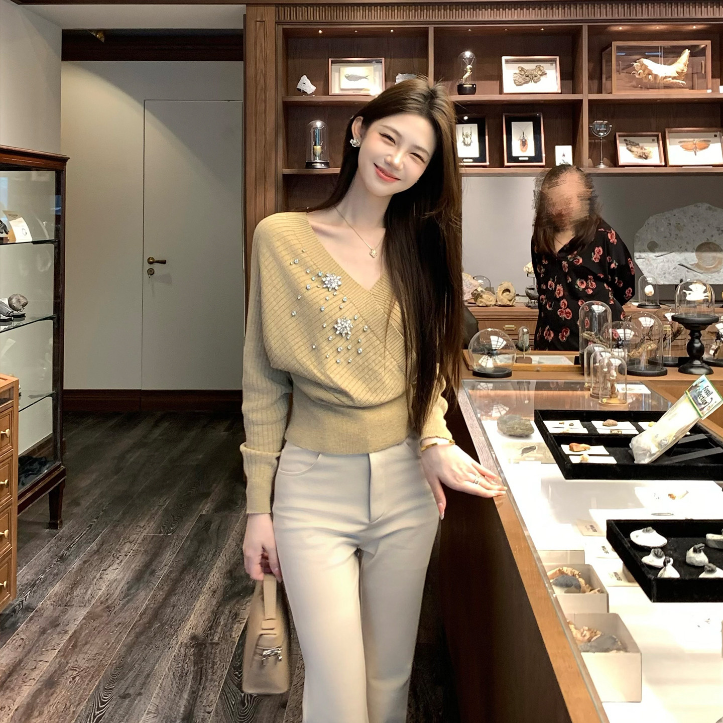 木子李的李轻熟优雅长袖V领针织衫羊毛上衣垂感针织喇叭长裤女冬