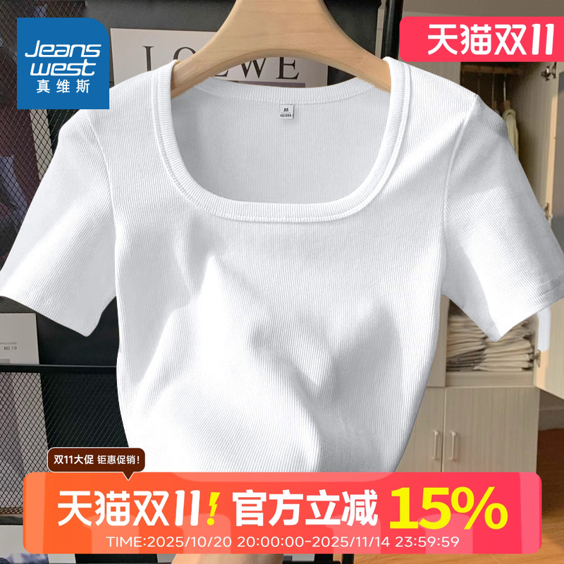 KMV真维斯白色内搭短袖t恤方领短款修身显瘦紧身夏季新款女士上衣