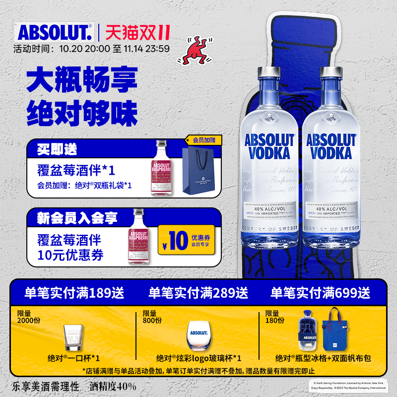 ABSOLUT绝对伏特加洋酒Keith Haring艺术瓶*2组合套装调酒进口新