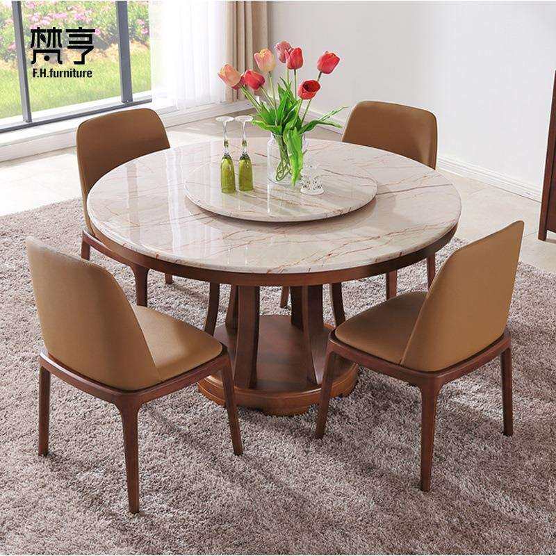 欧式大理石餐桌椅组合带6人转盘圆形餐桌 现代简约饭桌实木圆桌
