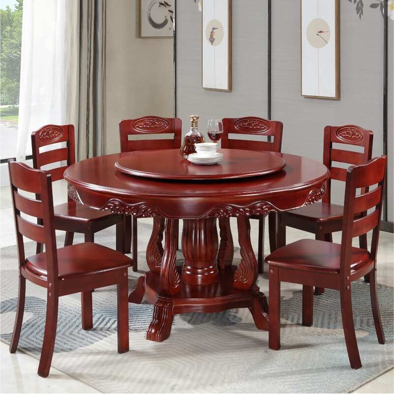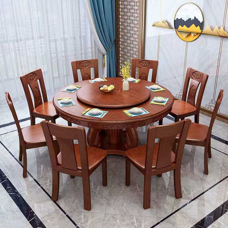 实木圆形餐桌椅中式雕花6/8/10人转盘桌家用饭店餐馆餐桌椅子组合