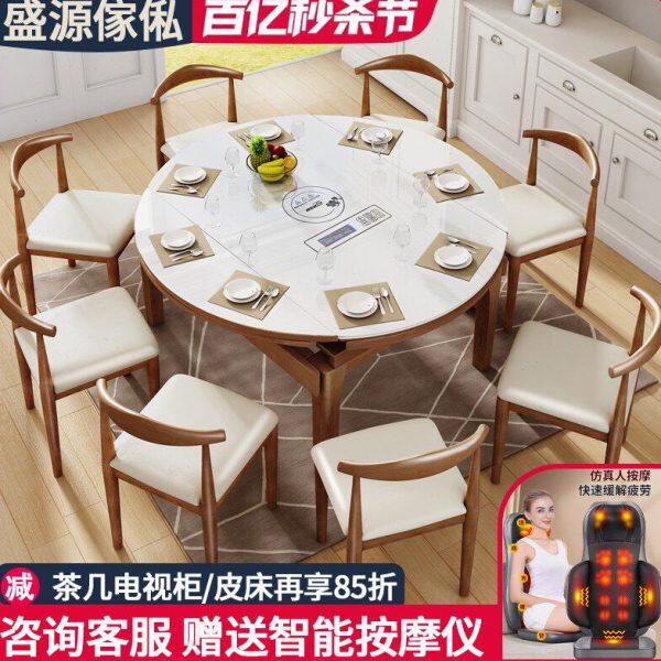 折叠实木餐桌圆形伸缩6人现代简约饭桌餐桌椅组合电磁炉钢化玻璃
