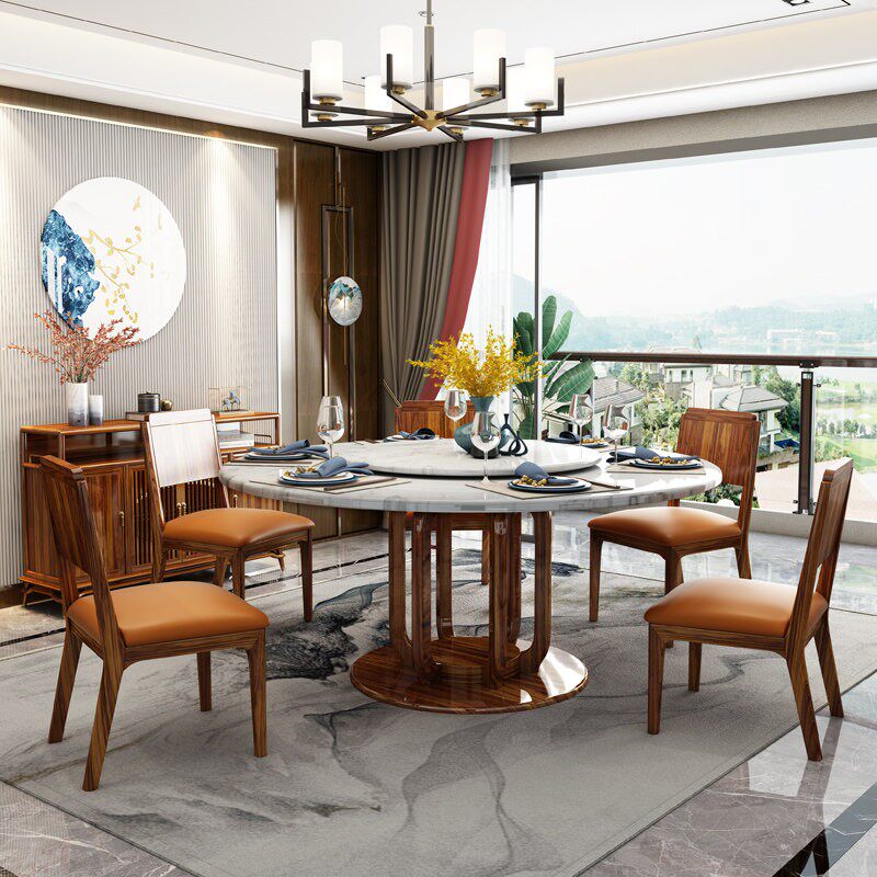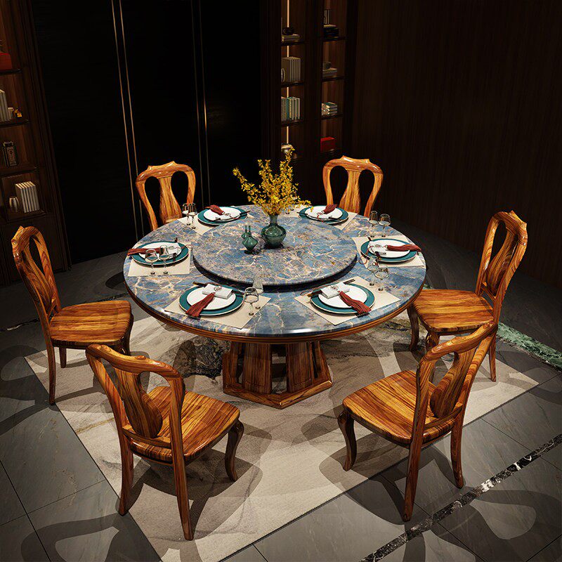 新中国风乌木大理石桌实木餐桌和椅子6人8人餐桌与转盘圆形组合家