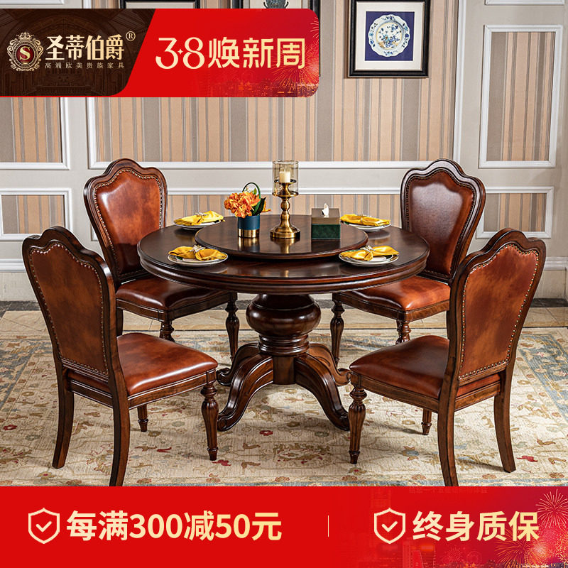 美式实木圆餐桌椅组合6人8人圆形餐厅饭桌欧式家用转盘桌子全实木