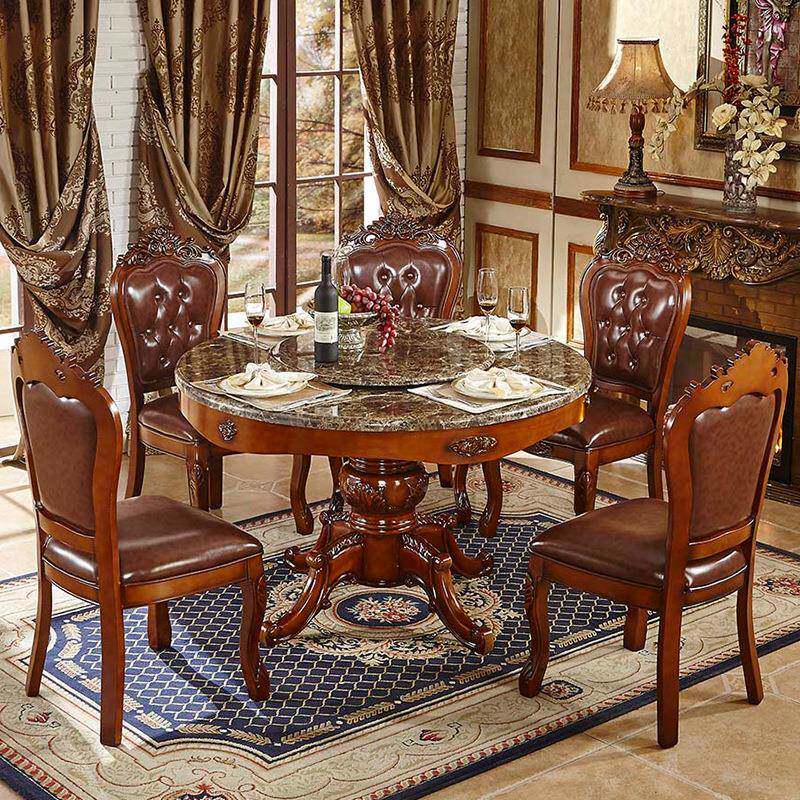欧式餐桌实木圆桌大理石餐桌椅组合6人圆形饭桌子带转盘别墅家用