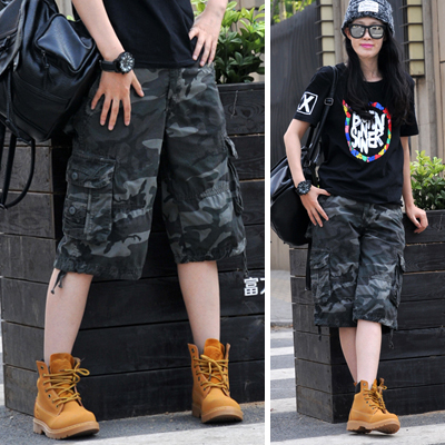 韩范潮牌 夏装水洗棉迷彩休闲七分裤情侣男女多兜工装裤直筒短裤