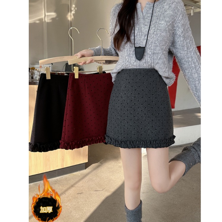 小吉家大码女装秋冬新款设计感A字木耳边波点半身裙高腰百搭短裙