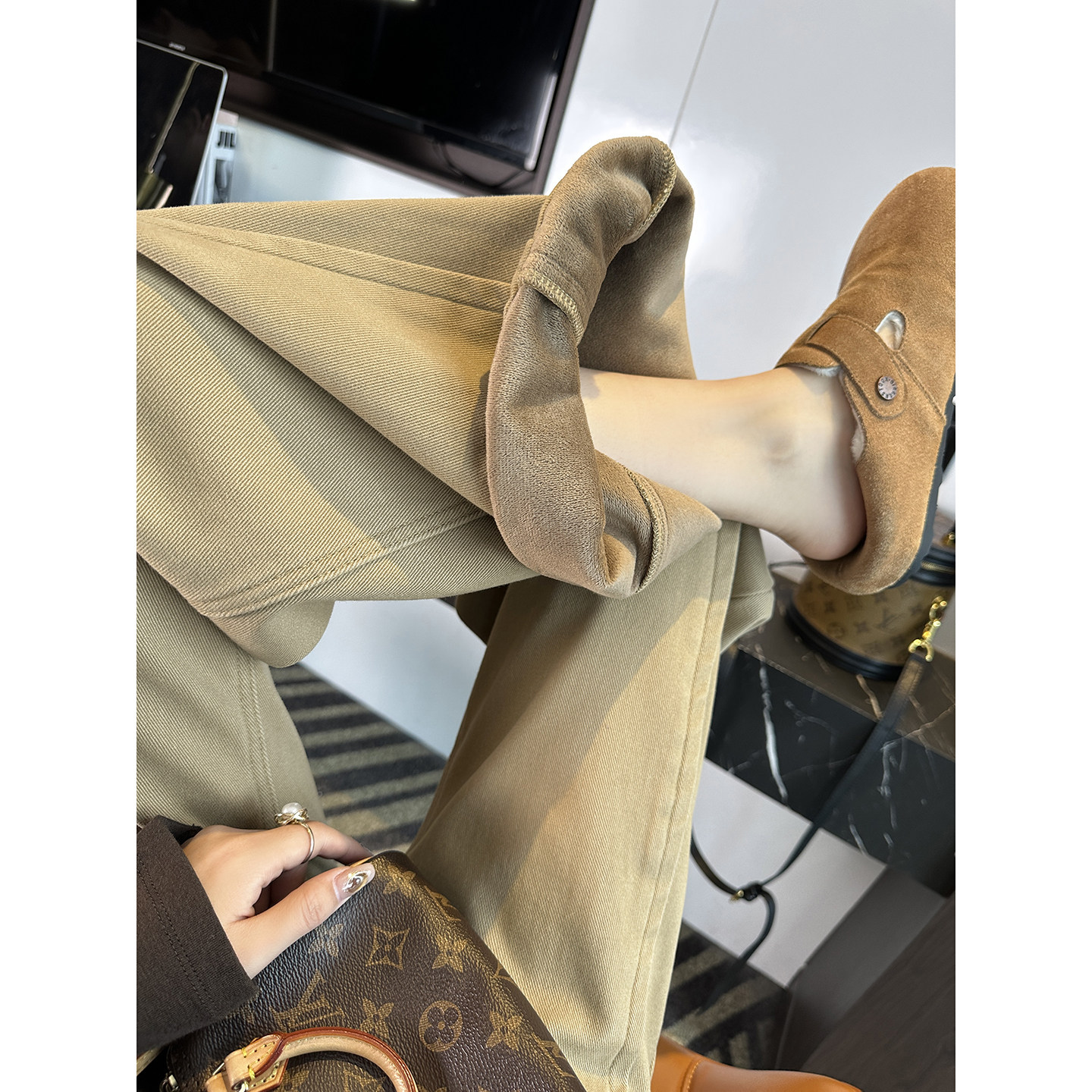 梨型救星!~遮胯立体侧骨阔腿牛仔裤女秋冬加厚绒卡其色宽松长裤