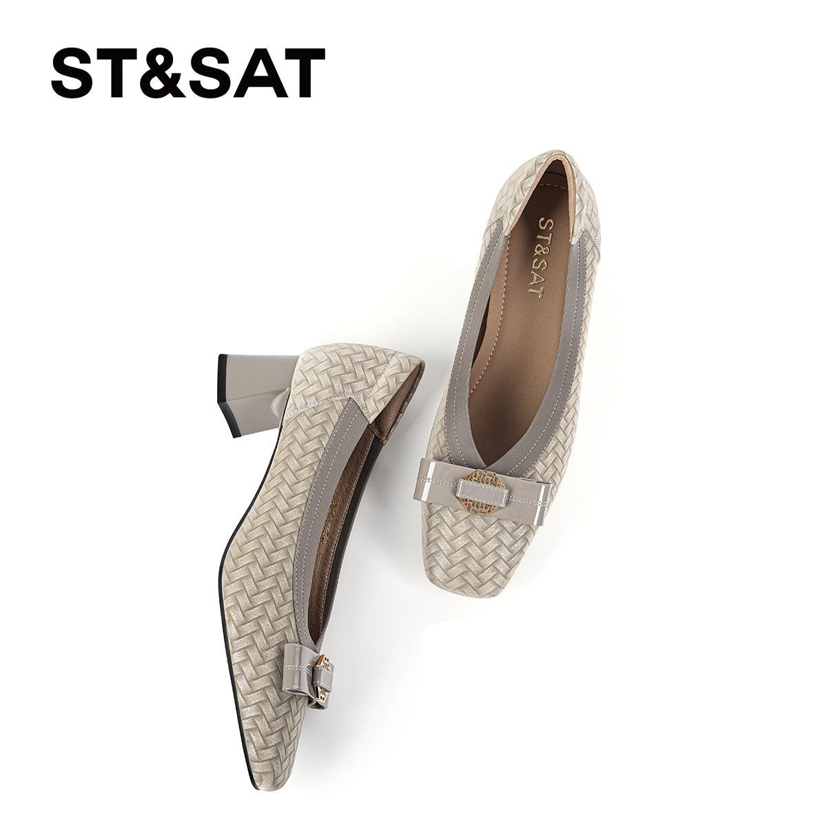 星期六英伦高跟鞋女2025新款方头粗跟蝴蝶结编织单鞋浅口通勤女鞋