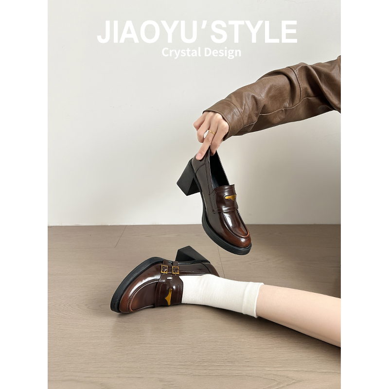 羊皮版~粗跟厚底乐福鞋女2025新款黑色高跟单鞋搭扣英伦风小皮鞋